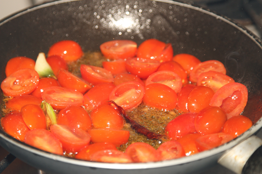 Dodajemy pomidorki i smażymy na małym ogniu 5 minut.