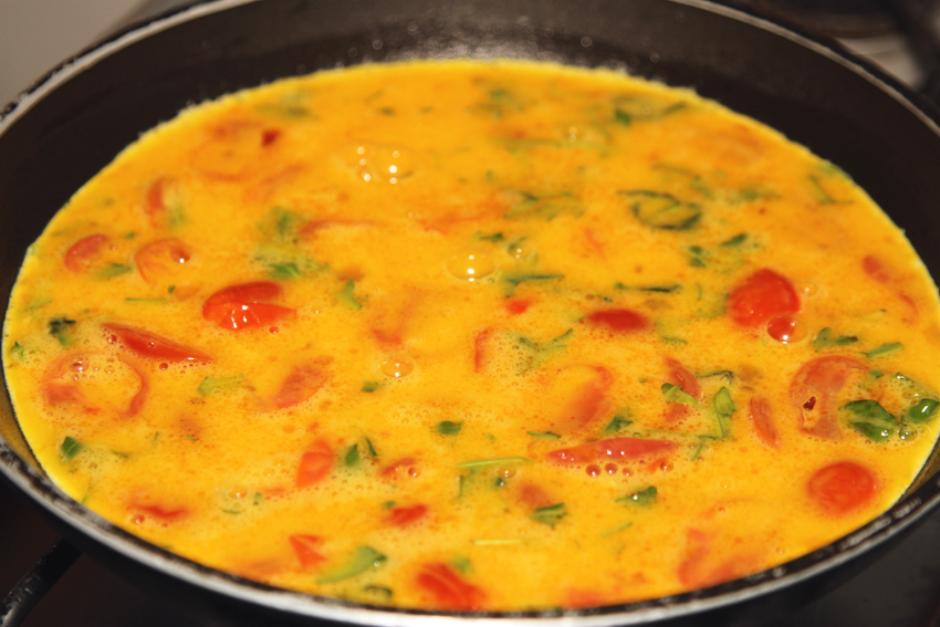 - Sposób I: Na patelni rozgrzewamy 2 łyżki oliwy i wlewamy jajka ze składnikami. Wstawiamy do nagrzanego do 180-190°C piekarnika i zapiekamy, aż wierzch będzie ścięty (15-20 minut).